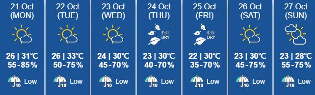 동쪽에서 불어오는 바람으로 오늘과 내일은 점차 맑은 날씨가 이어지겠다아침과 밤에는 기온이 내려가 낮과 밤의 기온차가 크며 최저 26도에서 낮최고 33도 사이로 건조하다.