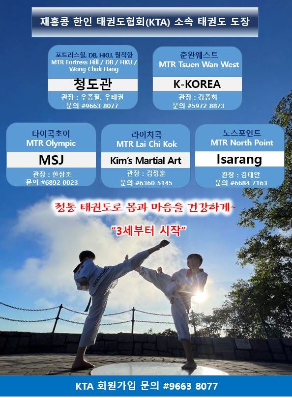 ▲노스포인트Isarang (관장김태안#6684 7163) ▲ 타이콕초이MSJ (관장한상조#6892 0023 ▲라이치콕Kim's Taekwondo ( 관장김정훈#6360 5145 ▲청도관(포트리스힐, DB, HKU, 웡척항:관장우종필 , 우태권#9663 8077) ▲K-KOREA (춘완웨스트:관장강종화#5972 8873)