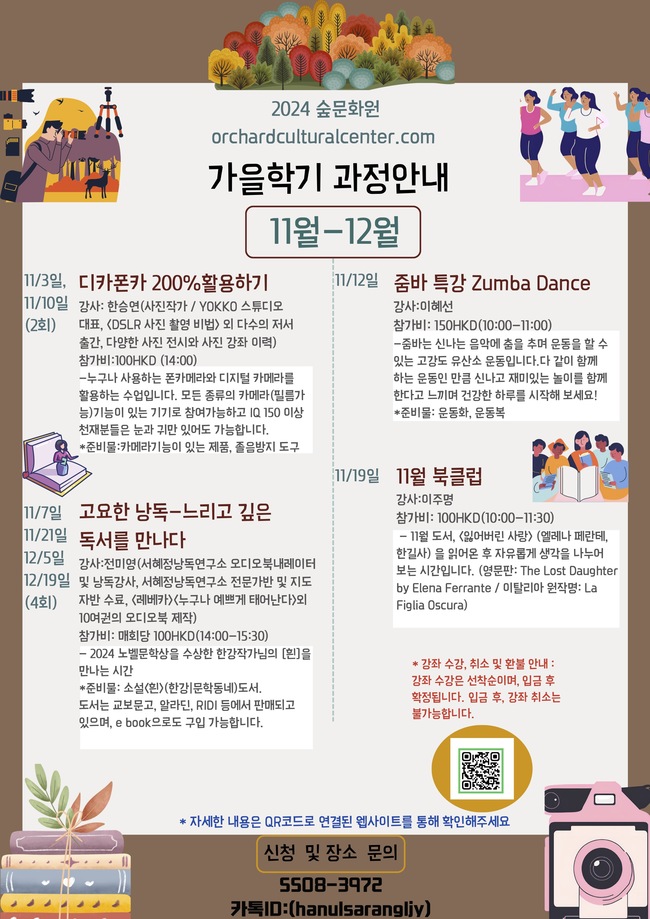 ■홍콩 숲문화원 클래식음악, 심리, 치즈, 줌바댄스, 운동, 미술, 북클럽, 사진, 생활광동어 등 다양한 인문학 강좌 제공. 10-11월 강좌 신청하세요! orchardculturalcenter.com