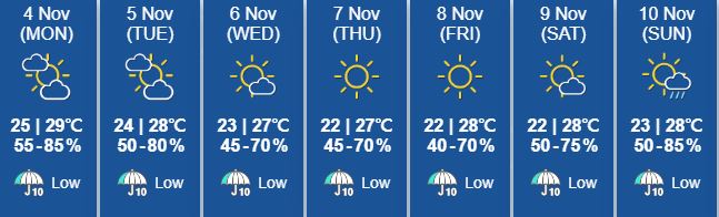 북동 계절풍이 중국 남부에 영향을 미치겠으며 대체적으로 약간 흐리거나 맑은 날씨 될 것으로 예상된다. 지역에 따라 건조하고 바람이 분다.