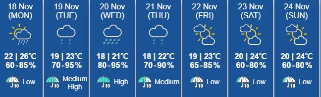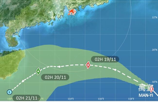 만리가 점차 약해질 것으로 예상되나 광둥 해안에 가까워지고 북동 계절풍과 합쳐져 내일 11월 19일(화) 바람이 강 불 것으로 예상되며 태풍 3호 경보는 오늘밤과 내일 아침까지 태풍 강도에 따라 고려된다.