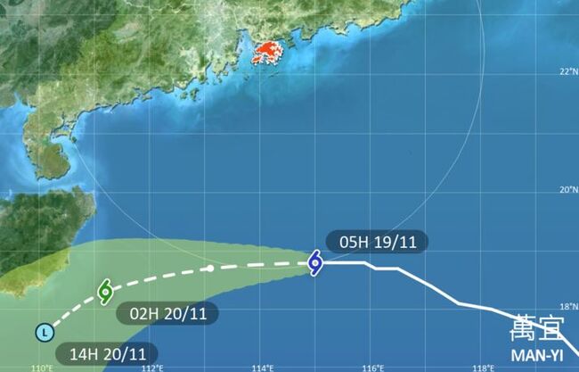 태풍 만이는 지난 몇 시간 동안 서쪽으로 이동하면서 광둥 해안에 영향을 미치고 있으며 바람과 함께 비가 내리겠다현재 태풍 1호 발령 중이다.