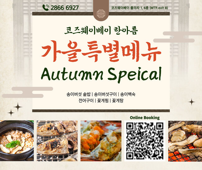 ■ 한아름 한식당 가을 특별메뉴(코즈웨이베이) : 전어구이, 꽃게찜, 꽃게탕, 송이버섯 솥밥