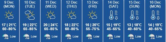 오는 12월 15일 최저기온이 13도까지 내려간다. 중국 남동부 전역에 구름대가 형성되어 홍콩 대부분 지역에서 습도가 약 60%로 비교적 안정적으로 유지된다.