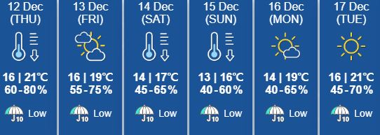 오늘 최저기온은 16도 토요일과 일요일에는 최저 13도까지 내려간다. 다음주초부터 중순까지 맑아지겠으며 기온은 상승하겠다.