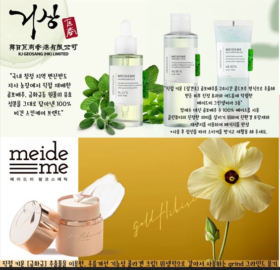 ■ Geosang 巨商 거상 (HK) Ltd. WWW.KJGEOSANG.COM 98년 역사를 자랑하는 대한민국 제약회사 1위 기업인 유한양행 산하 유한건강생활, 국내 청정 지역 변산반도 자사 농장에서 직접 키운 비건화장품 메이드미 Meideme가 Causeway Bay SOGO 백화점 B2F 지하2층 37호에서 할인 행사중 *문의전화 67686550
