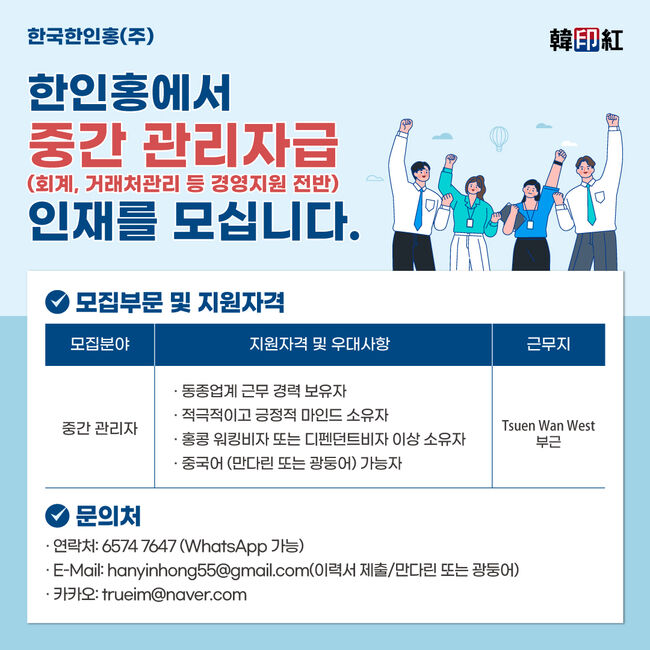 한인홍에서 '중간 관리자급' 인재를 모십니다.