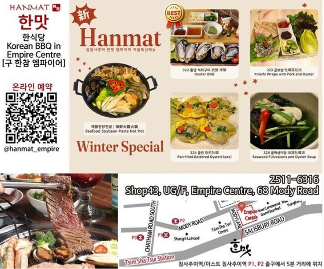 ▲ 한맛엠파이어(구한참엠파이어) 는문화나눔의한식당, 동침사츄이리갈구룡호텔맞은편, 예약번호2511 6316, 침사추이P1 , P2 출구 해물된장전골, 통영 석화구이, 굴전, 굴보쌈 예약 2511 6316