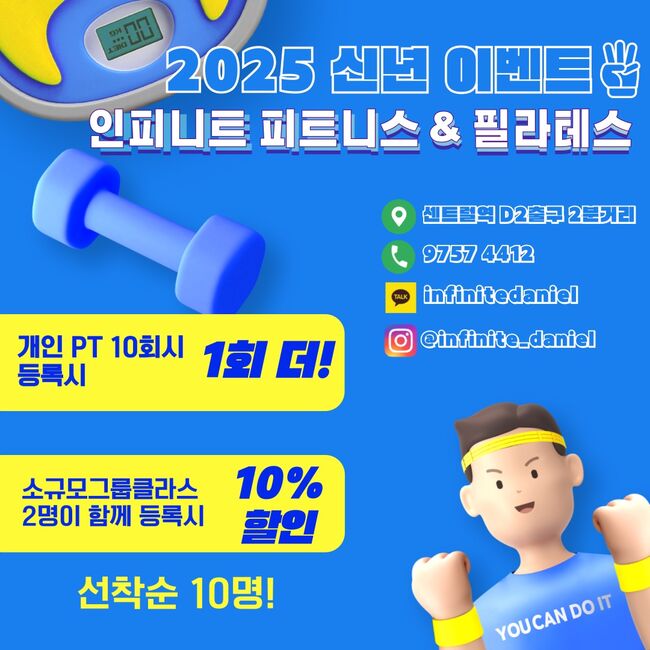 ■ 인피니트(INFINITE) 피트니스 & 필라테스 : “매년 못 이뤘던 새해 다짐, 올 해는 인피니트가 꼭 이뤄드립니다!” 신년맞이 개인 PT 10회+1회 더! 4인 최대 소규모 체중감량 그룹클라스 2명 이상 함께 등록시 10% 추가 할인! 근력운동 + 필라테스로 3개월 8kg 체중감량 목표!전화 9757 4412 / 카톡 문의 infinitedaniel / 인스타 & 유투브 @infinite_daniel / 리뷰보기 https://maps.app.goo.gl/e4PcXJD683B9NG5y9?g_st=com.google.maps.preview.copy