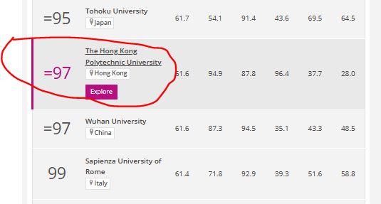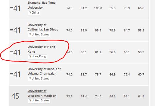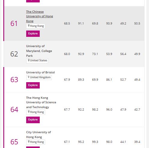 홍콩소재 대학교에서는 홍콩 대학교 41위, 중문대학교는 61위, 시티유는 65위, 폴리유는 97위, 마카오 대학교는 176위에 올랐다.