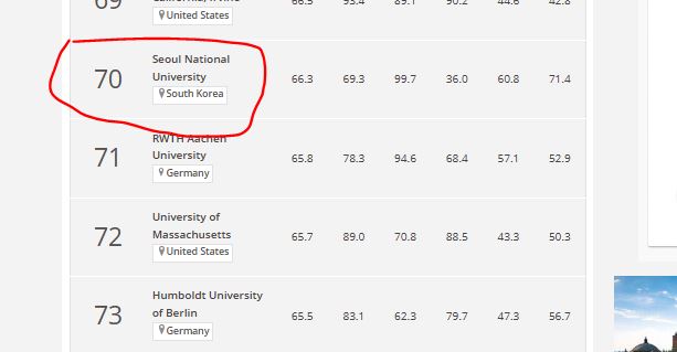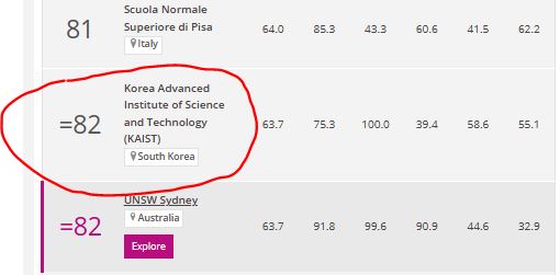 한국 소재 대학교는 서울 대학교가 70위, KAIST가 82위, 포스텍이 126위, 성균관 126위, 연세대학교 126위, 고려대학교가 151위에 올랐다.