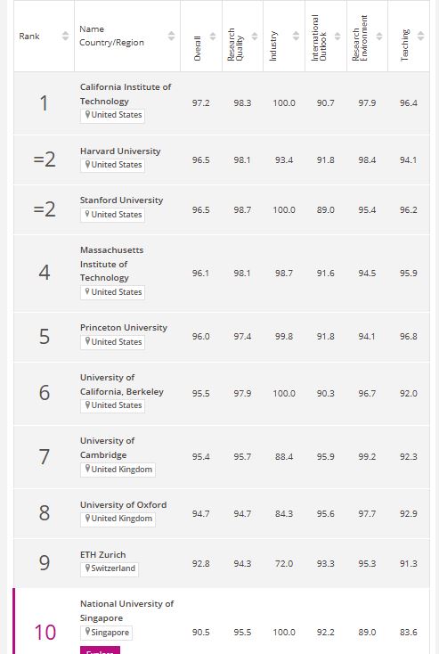 싱가포르 국립대학은 물리 과학 분야에서 10위권에 진입한 아시아 최초의 대학으로 순위에 올랐다.