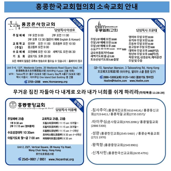 -타이쿠싱(온사랑교회(3705 2098)/ 홍콩엘림교회(2886 5300)