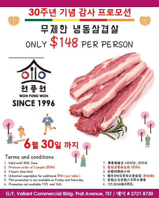 ■ 원풍원 한식당 30주년 기념!! 무제한 냉동삼겹살’ 프로모션 6월 30일까지