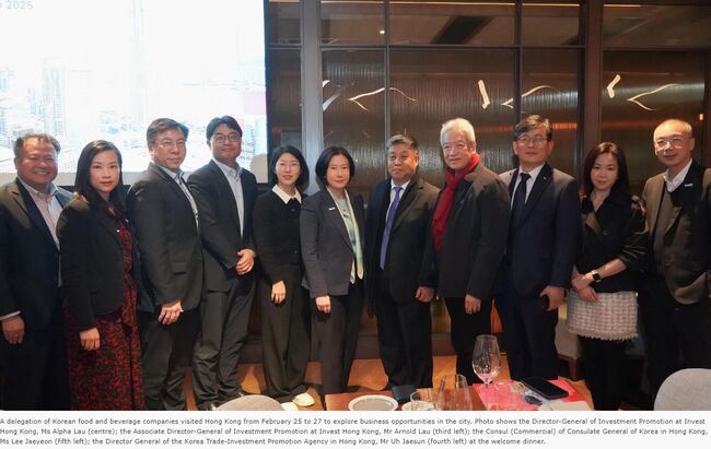 28일, 정부는 한국 F&B 대표단이 지난 2월 25일부터 27일까지 ‘홍콩에서의 사업기회’를 모색하기 위해 홍콩정부 산하 ‘인베스트홍콩’을 방문했다고 밝혔다.