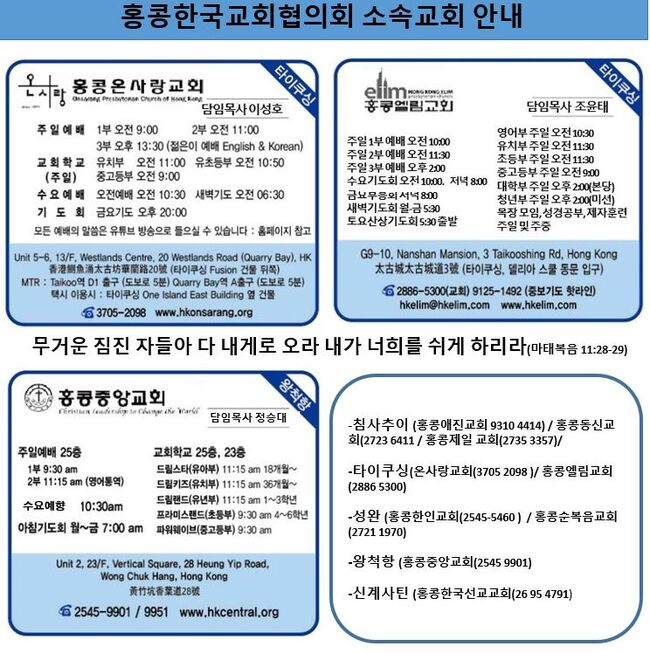 ▲▲홍콩한국교회협의회교회: ※왕척항(홍콩중앙교회(2545 9901) ※성완(홍콩한인교회(2545-5460 ) / 홍콩순복음교회(2721 1970)※침사추이(홍콩동신교회(2723 6411/홍콩제일 교회(2735 3357)/홍콩애진교회(9310 4414 ※타이쿠싱(온사랑교회(3705 2098)/ 홍콩엘림교회(2886 5300) ※신계사틴(홍콩한국선교교회(26 95 4791)