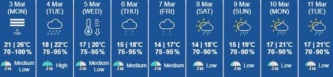오늘 3일은 기온이 계속 상승해 최고기온이 26도에 이를 것으로 예상된다그러나 내일 4()에는 18도까지 떨어지겠으며 6()에는 번개를 동반한 소나기가 내리겠으며 15도까지 떨어지겠다.