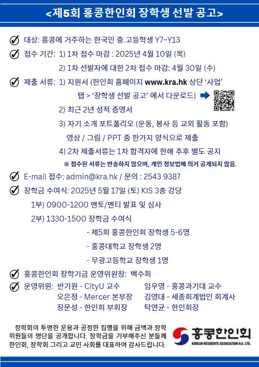 ■ "제 5회 홍콩한인회 장학생 선발공고"