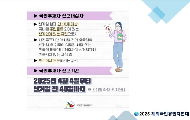 ▲ 국외 부재자 신고기간 ㅣ 2025년 4월 4일부터 전 40일까지(선거일 확정 후 재안내 예정)