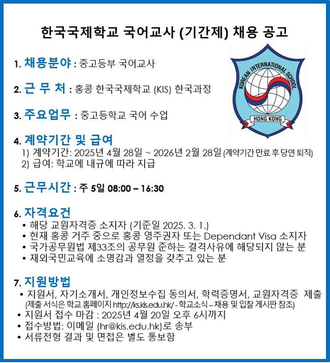 한국국제학교 국어교사 (기간제) 채용 공고