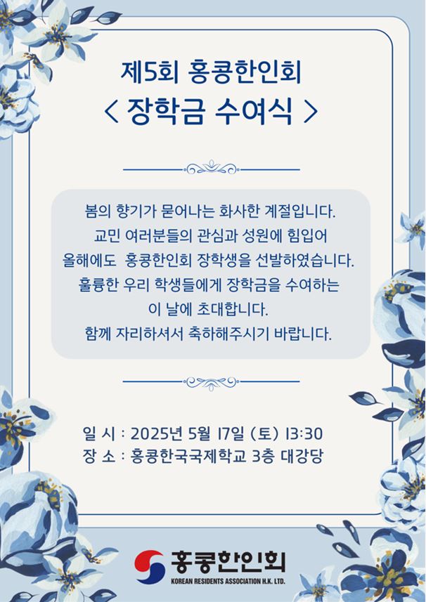 제5회 홍콩한인회 장학금 전달식도 이어질 예정이오니, 많은 분들의 관심과 참여 부탁드립니다. 감사합니다.