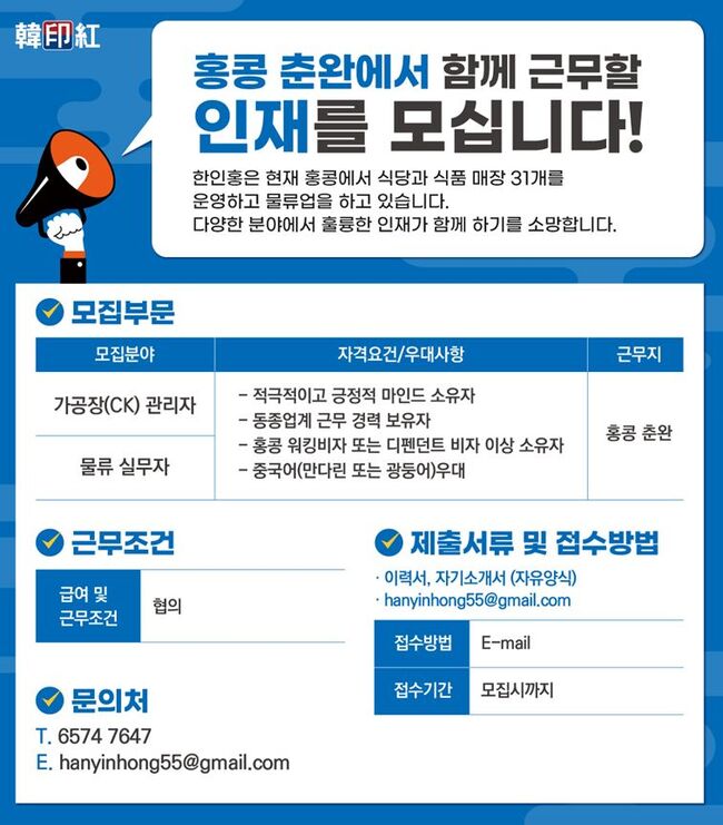 한인홍 직원채용 공고(춘완지역 근무)