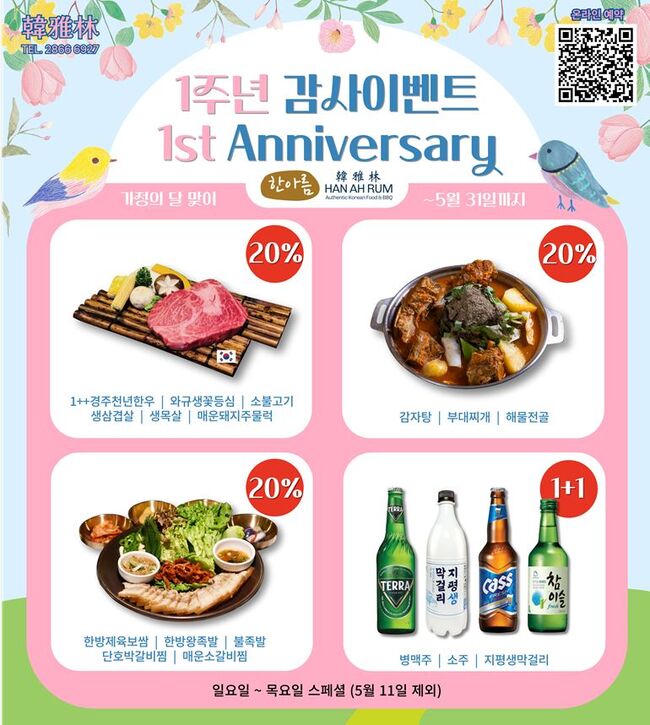 ■ 한아름 한식당 코즈웨이베이 : 한아름 1주년 감사이벤트 : 20% 할인(1++경주천년한우, 와규생꽃등심, 부대찌게, 해물전골, 한방 왕족발 등 예약 2866 6927