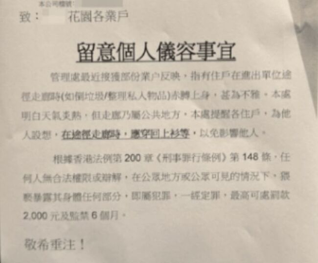 최근 홍콩섬 노스포인트 아파트단지에서 일부 남성들이 옷을 벗고 공용 공간을 돌아다니지 말라는 경고장이 붙어 화제이다해당 주택 관리소는 상의를 입지 않는 남성들에 대한 민원들이 제기됐다고 지적하고 홍콩 형법 위반 가능성을 언급했다.