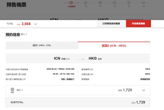 왕복운임 : HKD2,900 / 세금 포함 총액 HKD3,666