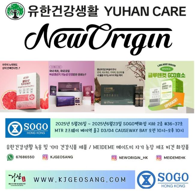 ■ Geosang 巨商 거상 (HK) Ltd. WWW.KJGEOSANG.COM 98년 역사를 자랑하는 대한민국 제약회사 1위 기업인 유한양행 산하 유한건강생활, 국내 청정 지역 변산반도 자사 농장에서 직접 키운 비건화장품 메이드미 Meideme가 Causeway Bay SOGO 백화점 B2F 지하2층 37호에서 할인 행사중 *문의전화 67686550