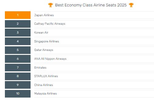 홍콩 국적기인 캐세이 퍼시픽 항공이 2025년 세계 최고 이코노미 클래스 항공사 상을 수상했다. 뒤를 이어 카타르 항공이 2위, 싱가포르 항공이 3위를 차지했다.