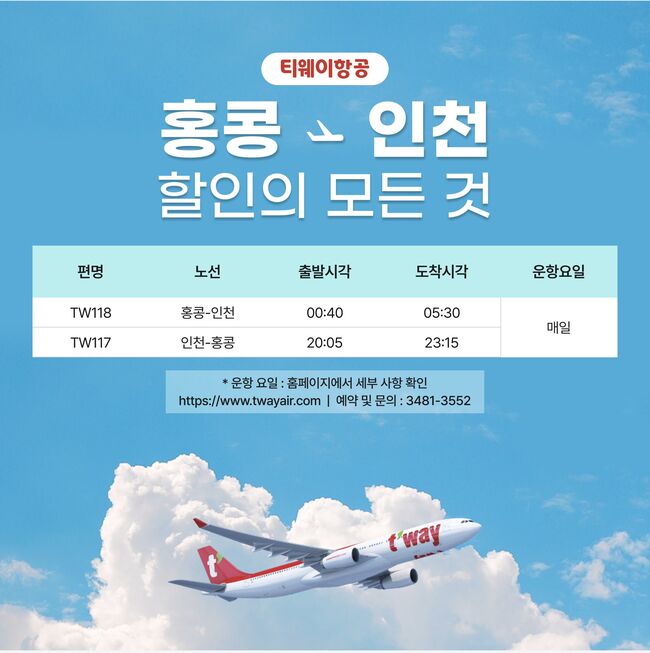 ■ 티웨이항공, 홍콩-인천 노선 매일 운항/ 인천/홍콩 노선 비즈니스 운임 비즈니스 편도 운임 : HKD1,450 / 세금 포함 총액 HKD1,937, 왕복운임 : HKD2,900 / 세금 포함 총액 HKD3,666