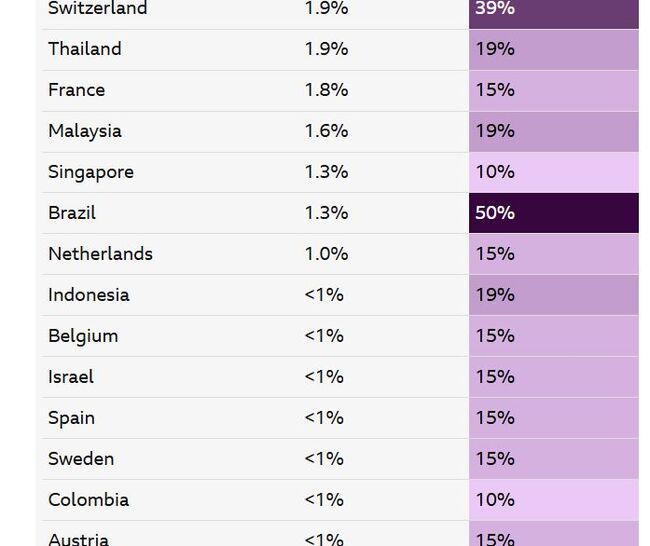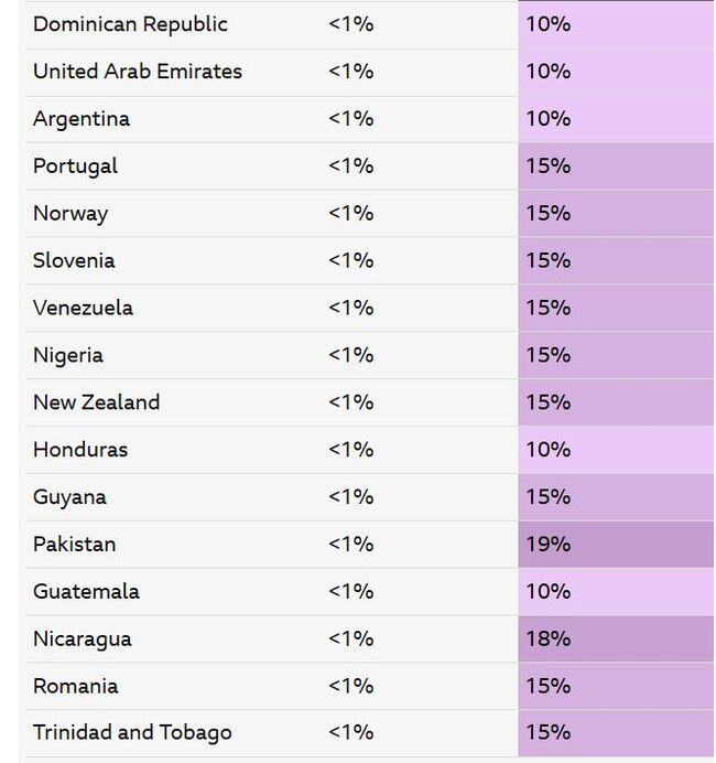 스위스는 39%, 이라크는 35%, 베트남 20%, 인디아 25%가 부과된다.