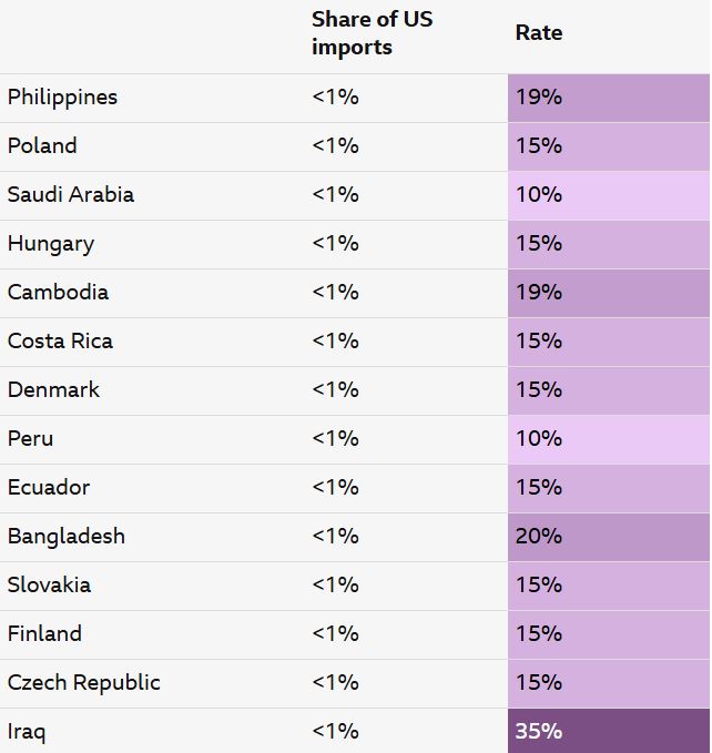관세 10% 부과국가는 싱가포르, 과테말라, UAE, 온두라스, 도미니카공화국, 페루 등이며