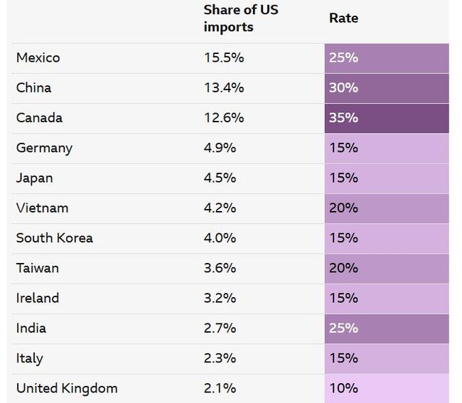 이 관세는 외국 상품을 미국으로 수입하는 기업들이 정부에 세금을 납부해야 한다는 것을 의미한다. 이러한 기업들이 비용을 소비자에게 전가할 수 있어 매우 중요하다. 새로운 관세는 8월 7일부터 발효되지만, 한국은 8월 1일부터 15%, 캐나다는 35%의 관세를 부과받게 된다
