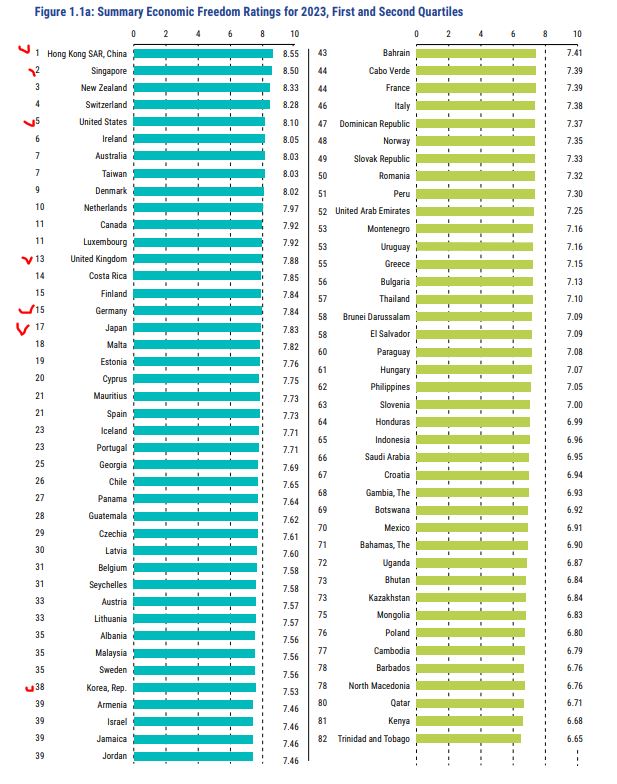 1위 홍콩, 2위 싱가포르, 3위 뉴질랜드, 미국 5위, 영국 13위, 독일 15윌, 일본 17위, 한국은 38위에 올랐다.