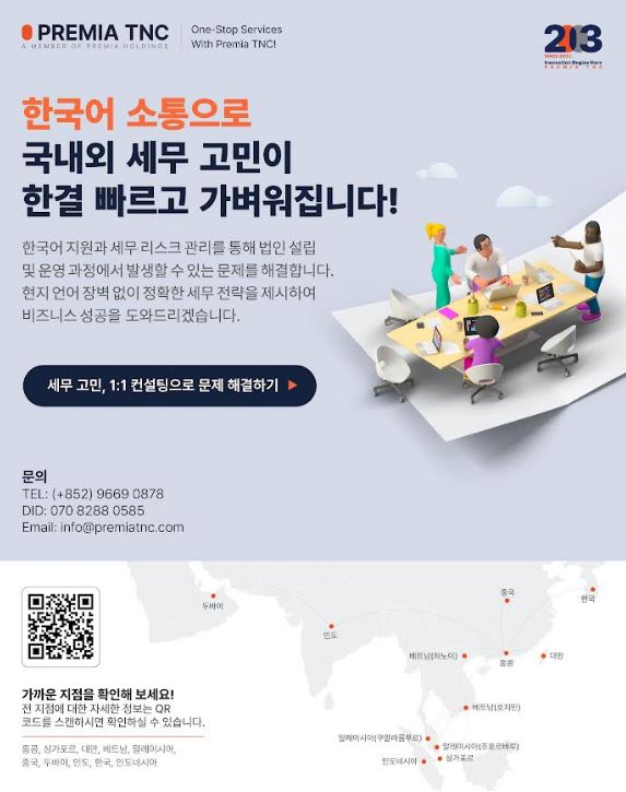 ■ 프레미아티엔씨(구코차이나티엔씨) : 법인설립/관리, 회계결산, 세무자문및회계감사+852 9669 0878 info@premiatnc.com / 웹사이트 https://premiatnc.com/kr//