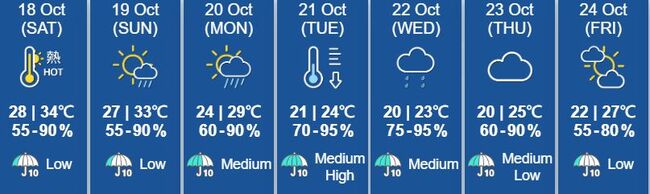월요일 아침 홍콩에서 약 500km 떨어진 곳에 도달할 것으로 예상되며, 화요일 아침까지 400km 이내로 접근하여 최대 풍속 시속 120km의 태풍 강도에 도달할 것으로 예상된다.