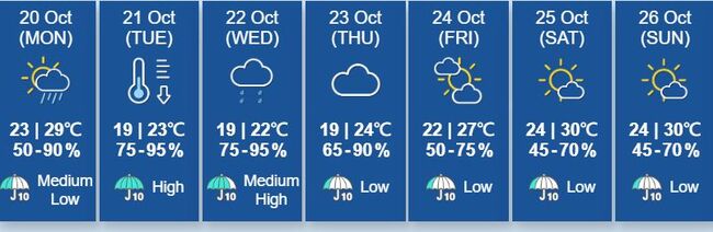 화요일과 수요일 초에는 비가 더 자주 내리겠고 화요일부터 목요일까지 도심 지역은 기온이 약 19도까지 크게 떨어지고, 신계 지역은 2도 정도 더 낮아진다.