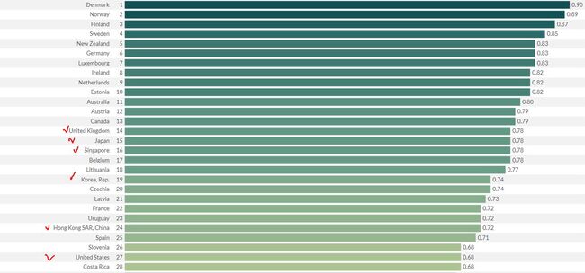 1위 덴마크, 영국 14위, 일본 15위, 싱가포르 16위, 한국, 19위, 홍콩 24위, 미국 27위, 중국 92위