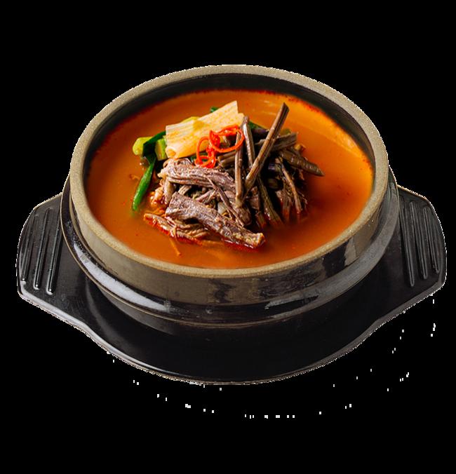 - 제주도 고사리의 특유의 향과 부드러운 한우를 넣어 만든, 맵지 않으면서 얼큰한 맛