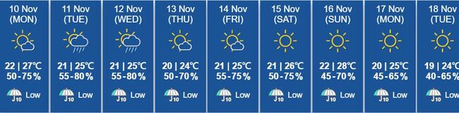 풍웡(Fung-wong) 태풍과 북동계절풍의 영향으로 앞으로 며칠 동안 바람이 강하고 기온이 약간 낮겠음며. 이번 주 중반에는 도심 지역의 기온이 20도 안팎으로 떨어질 것으로 예상된다.