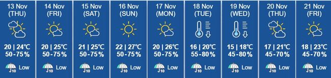 1119일 최저 기온은 홍콩 전역에서 눈에 띄게 떨어질 것으로 예상된다웡척항와글란 섬의 최저 기온은 15°C로 예상되며그 외 대부분 지역은 14°C 이하로 떨어질 것으로 예상된다.