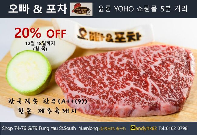 ■ 오빠&포차: (윈롱YOHO 쇼핑몰근처):  BBQ 20% 할인(월-목) 12월 18일까지  한국직송한우(A++(9)최상급,  예약 6162 0798 / 카톡 andyhk82andyhk82 ) 한돈, 제주흑돼지 - 삼겹살, 목살 - 감자탕, 부대찌개 - 장어구이 주소 : Shop 74-76 G/F9 Fung Yau St.South  Yuenlong Tel.:6162 0798 (윈롱MTR 출구F)