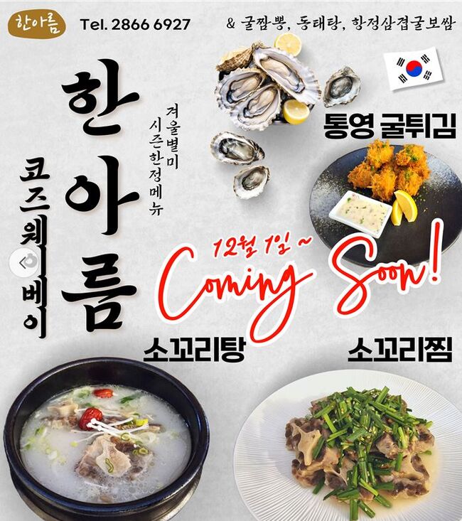 한아름(코즈웨이베이) 굴짬뽕, 동태탕, 굴보쌈 소꼬리탕, 소꼬리찜, 통영 굴튀김,