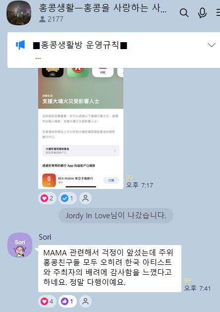 한 교민은 "마마 관련해서 걱정이 앞섰는데 주위 홍콩친구들 모두 오히려 한국 아티스트와 주최자의 배려에 감사함을 느꼈다."고 전하고 "정말 다행이예요"라고 덧붙였다.