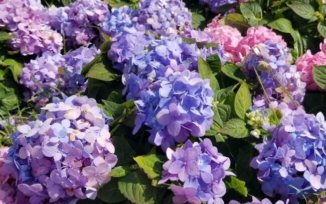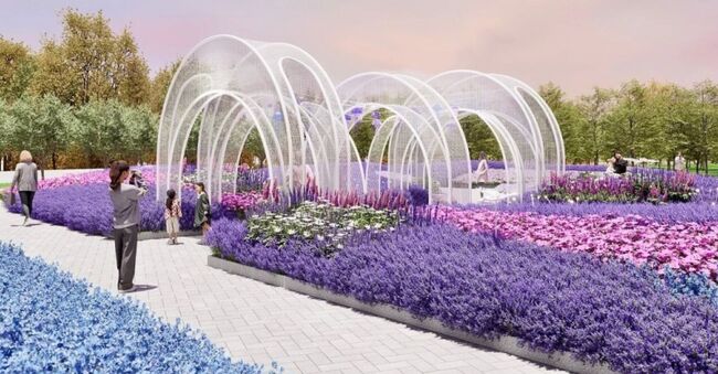 이 꽃 전시회에는 라벤더, 슈퍼 세이지, 대형 델피늄, 루빙화 등 다양한 보라색 꽃들이 세 화분씩 심어져 있다.