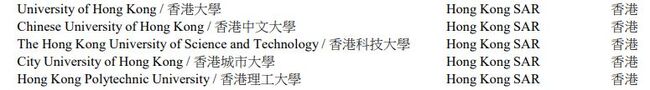 홍콩소재 대학교는 홍콩대학교, 중문대,  홍콩과기대시티유, 폴리유가 포함되었다.