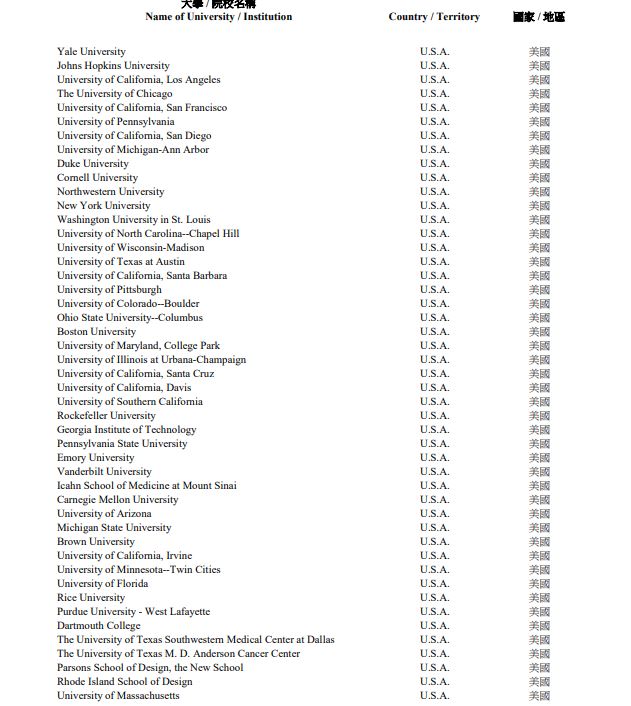 이 목록에는 QS 세계 대학 순위에서 "호텔 및 레저 경영분야 상위 5위 안에 든 호텔 전문 프로그램을 제공하는 대학 또는 기관, QS 세계 대학 순위에서 "예술 및 디자인분야 상위 5위 안에 든 전문 기관그리고 지난 5년간 상하이 자오퉁 대학이 발표한 중국 최고 대학 순위에서 상위 20위 안에 든 본토 대학들이 포함된다