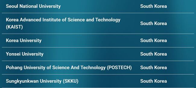 한국소재 대학교는 KAIST, 서울대학교연세대학교고려대학교성균관대학교, POSTECH이 포함된다